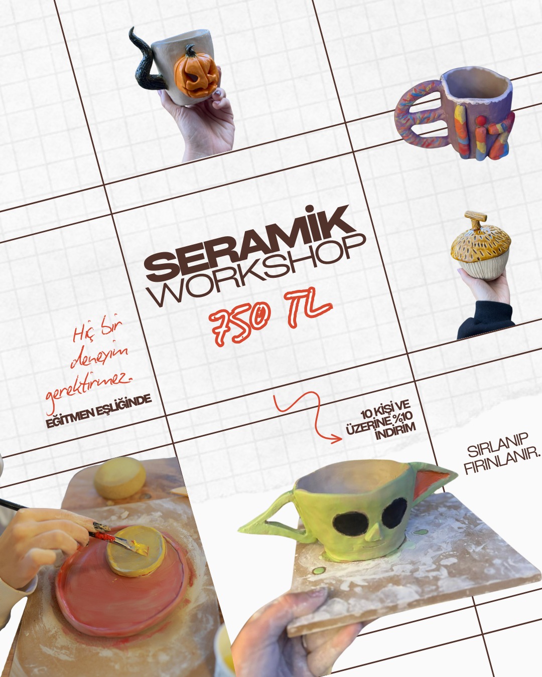 Eğitmen eşliğinde istediğiniz obje hamura şekil vererek hayat bulur. boyama işlemi ve sırlanıp fırınlanma aşamaları ücrete dahildir.Ortalama 2,5-3 saat sürmektedir.
