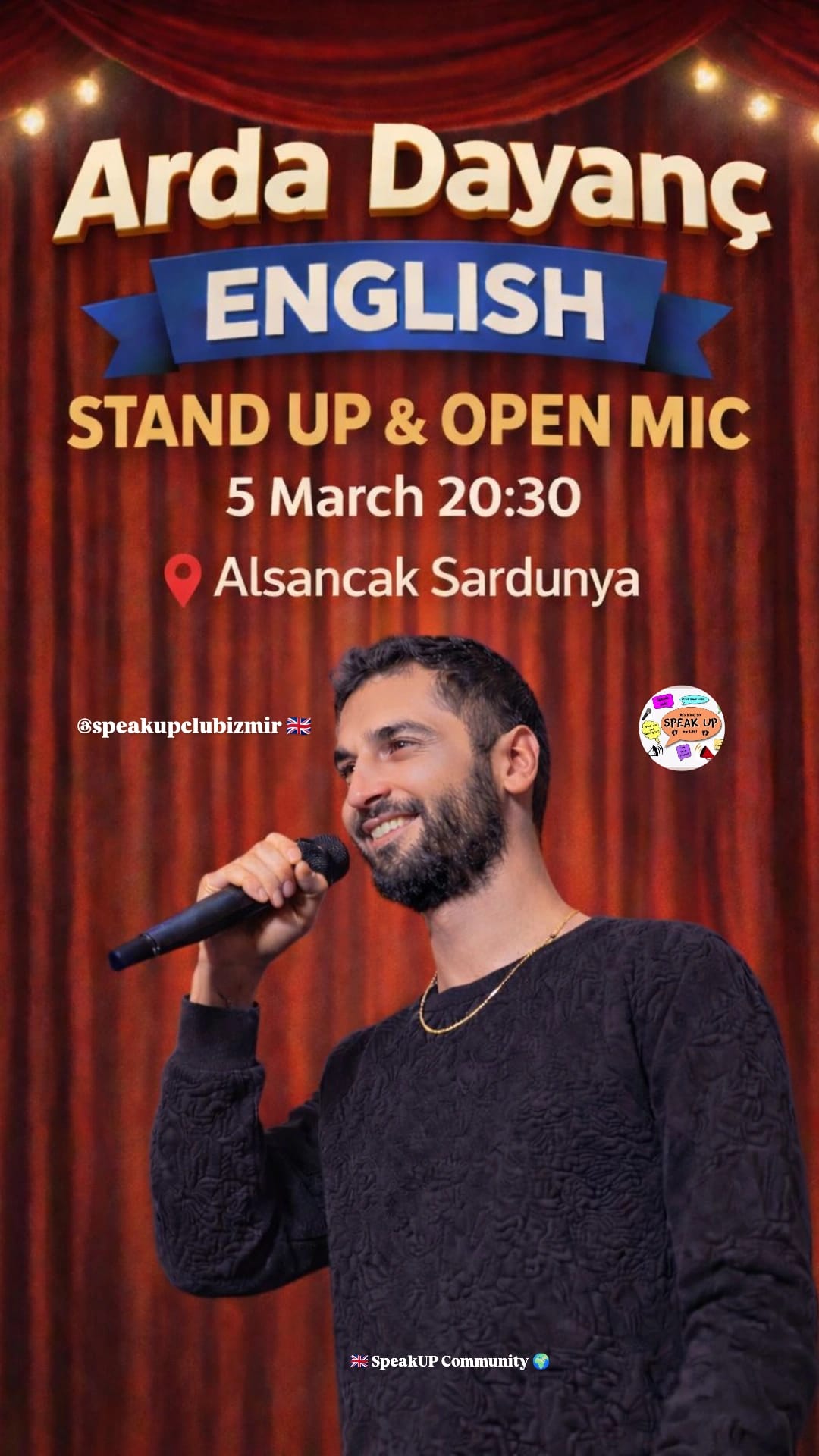 İzmir’de **İngilizce stand-up** gösterisine hazır mısın? İlişkilerden sosyal hayata, günlük hayatın absürtlüklerinden politik gündeme uzanan esprileriyle **Arda Dayanç**, İngilizce stand-up performansıyla izleyicilerle buluşuyor. Hayatın içinden gözlemlerle şekillenen bu gösteride kimi zaman kendinizden bir parça bulacak, kimi zaman da gündeme farklı bir pencereden bakacaksınız. 30 dakikalık stand-up performansının ardından sahne sizin! Açık mikrofon bölümünde sahneye çıkabilir, kendi hikayenizi anlatabilir ve İngilizce şakalarınızı deneyebilirsiniz. İster ilk defa deneyin ister sahneye alışkın olun — bu gece, İngilizcenizi sahnede kullanma cesareti gösteren herkes için. ️Bu etkinlikte SpeakUP tanıtım desteği sağlamakta olup etkinlik Arda Dayanç’a aittir. Yalnızca biletli veya nakit ödemeli giriş kabul edilir, hiç kimse için misafir girişi yoktur. 🇬🇧 🌍 Are you ready for an English stand-up show in İzmir? From relationships to social life, from the absurdities of daily routines to political agendas, Arda Dayanç meets the audience with his English stand-up performance. In this show shaped by observations from everyday life, you may sometimes find a piece of yourself, and sometimes look at current issues from a completely different perspective. After the 30-minute stand-up performance, the stage is yours! During the open mic session, you can come on stage, share your own story, and try out your English jokes. Whether it’s your first time or you’re used to the stage — this night is for everyone who dares to use their English on stage. SpeakUP provides promotional support for this event; however, the event belongs to Arda Dayanç. Entry is only allowed with a ticket or cash payment. There is no guest list or free entry.