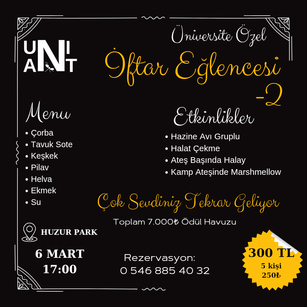 UnıAnt İle Iftar Eğlencesi'ne davetlisiniz! 6 Mart 2026 tarihinde, Huzur Park'ta gerçekleşecek bu özel etkinlikte, enerjik bir atmosferde dostlukları pekiştirecek ve eğlencenin doruklarına ulaşacaksınız. İftar saatinin getirdiği huzur ile birlikte, müzik ve eğlence dolu bir akşam geçirmeniz için tüm hazırlıklarımız tamamlandı. 🎉 Bu yılki UnıAnt İle Iftar Eğlencesi, sadece bir iftar buluşması değil; aynı zamanda unutulmaz anılar biriktireceğiniz bir topluluk etkinliği. Birbirinden keyifli aktiviteler, canlı müzik performansları ve lezzetli yemekler ile dolu bir gece sizleri bekliyor. Arkadaşlarınızla birlikte eğlencenin tadını çıkarırken, yeni insanlarla tanışma fırsatı bulacak, sosyal bağlarınızı güçlendireceksiniz. 🌙 Huzur Park'ın büyüleyici atmosferinde, iftar sonrası geçireceğiniz saatler, enerjinizi tazeleyecek ve ruhunuzu besleyecek. Eğlencenin yanı sıra, bu etkinlikte topluluğun bir parçası olmanın tadını çıkaracak, birlikte keyifli anlar yaşayacaksınız. Unutmayın, bu etkinlikte yer almak, sadece bir bilet almakla kalmayacak; aynı zamanda yeni dostluklar ve güzel anılar kazanacaksınız. 🤝 Haydi, bu eşsiz deneyimi kaçırmayın! UnıAnt İle Iftar Eğlencesi için biletlerinizi hemen alın ve eğlence dolu bir akşam için yerinizi ayırtın. Sınırlı sayıda bilet ile bu fırsatı değerlendirin, birlikte eğlenelim! 🎟️