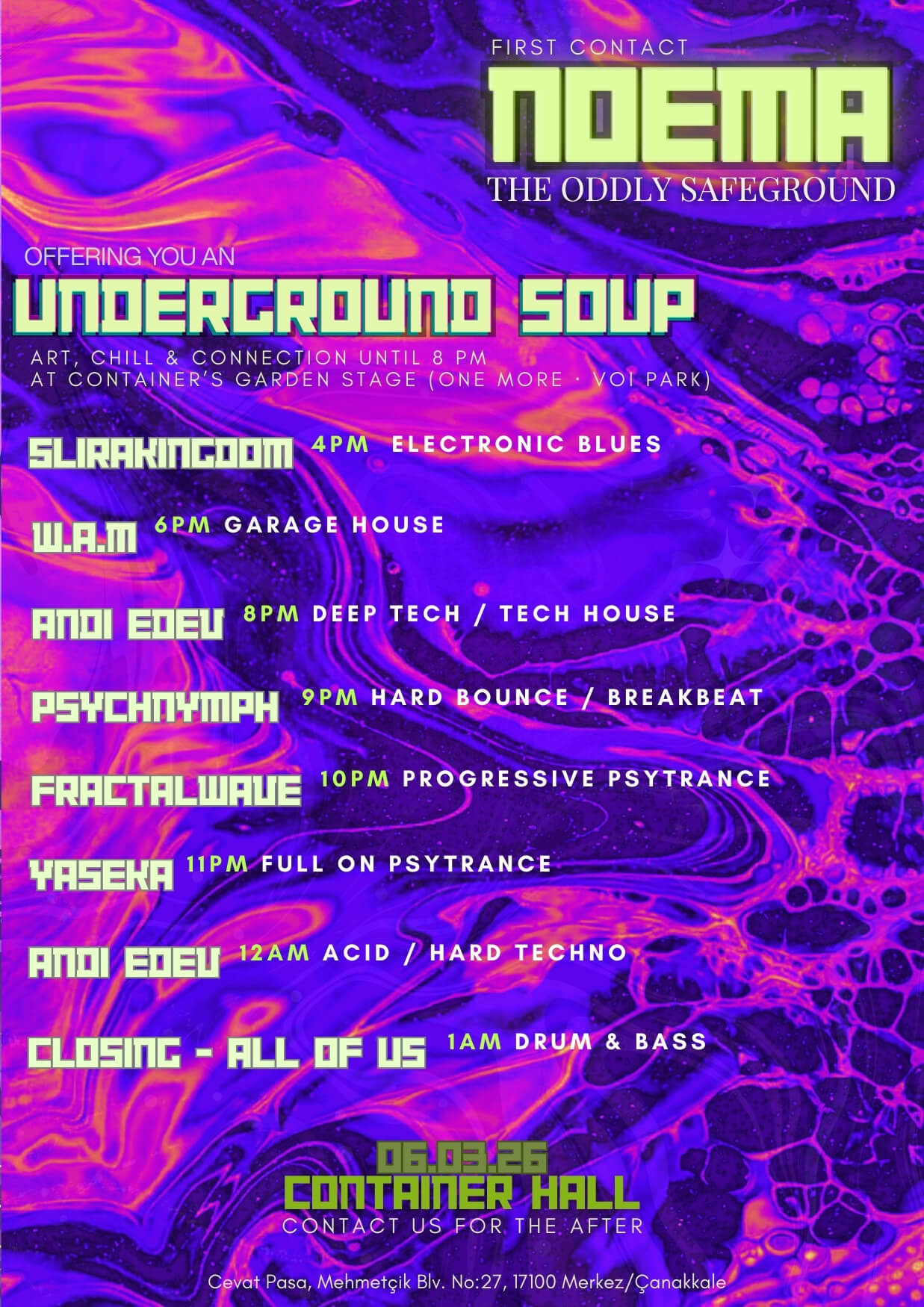 Noema The Oddly Safeground Opening Gathering / First Contact (Noema - Garip Şekilde Güvenli Alan - İlk buluşma) Ait hissetmek için bir aile, sistemi yıkmak değil, içinde nefes alan bir alan yaratmak hayali ile. UNDERGROUND SOUP Bu partide headliner olmamakla, headliner öykünün kendisi, uzun planlamalar sonucu; herkesin katkısı üzerine, ortak öykümüzdür. Sanatçılar, katılımcılar ve alan sağlayanlar öykünün kahramanlarıdır. GARDEN STAGE 16.00 - 20.00 16.00’da Container Hall'un bahçesindeki One More - Voi Park’ta buluşuyor @5lirakingdom’ın Electronic Blues’u ile start verip @W.A.M’ın Garage House’u ile ısınıyoruz. Takas ve Vintage pazarlarına/sanatsal çalışmalara alan açıyor, boyalarımızı alıp gelelim, dekorlarımızı ve sahnemizi kendimiz hazırlayalım diyoruz. Dostane tavır, geri dönüşüm, sürdürülebilirlik, non-kapitalist bakış açısı genel havaya hakim. Standlar ücretsizdir. Garip şeylerinizi getirebilirsiniz : ) MAIN STAGE 20.00 - 01.30 Hava karardıkça müziğin tonu değişiyor, iç mekandaki ana sahnede sekiz underground türün oluşturduğu, sürekli yükselen ve arada nefes aldıran elektronik momentumun fitilini; 20.00'da ateşliyoruz. (After için kontak kurabilirsiniz. (Birkaç gün önceden lütfen)) (Dress-Code olmamakla beraber rahat şeyler giymenizi öneririz yine de her türlü çılgınlığa hazırız.) görüşmek üzere <3 - Noema The Oddly Safeground - Opening Gathering / First Contact UNDERGROUND SOUP To feel a sense of belonging as a family, not to tear down the system, but to create a space within it where we can breathe. In this party, there is no headliner; the headliner is the story itself. After long planning, it is our shared story, built upon everyone’s contribution. The artists, the participants, and those who provide the space are the heroes of this story. GARDEN STAGE 16.00 – 20.00 At 16:00 we gather at One More – Voi Park, located in the garden of Container Hall. We start with @5lirakingdom’s Electronic Blues and warm up with @W.A.M’s Garage House.